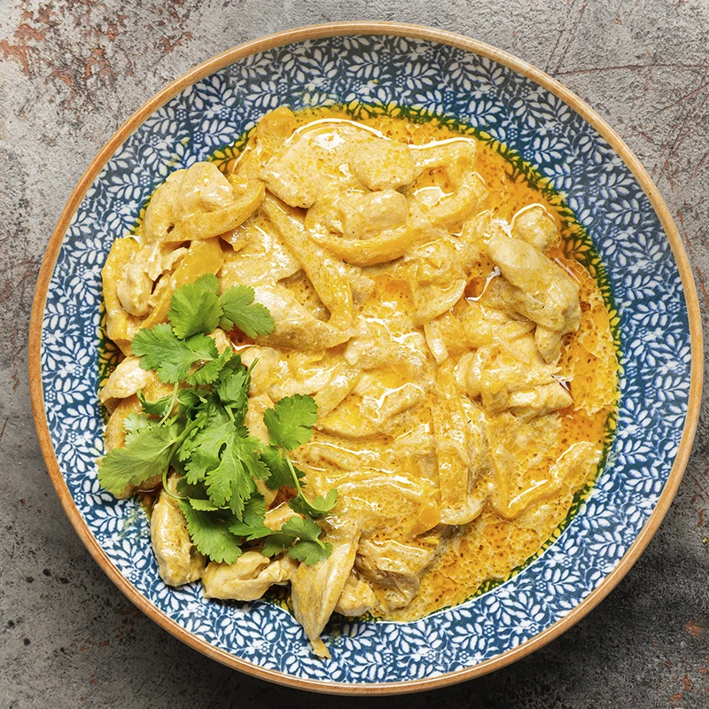 Томленое куриное филе с болгарским перцем и карри в индийском стиле. Подается с рисом.